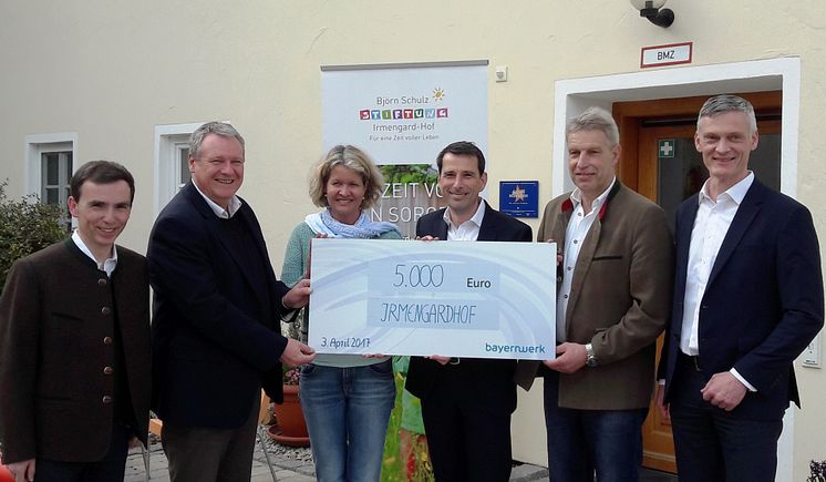 v.l.: Dr. Dietmar Buchner, Bayernwerk-Bereichsleiter Organisation, Gerhard Foitzik, Björn Schulz Stiftung Sozialmarketing, Marjon Bos, Leitung Irmengard-Hof, Bayernwerk-Personalvorstand Andreas Ladda, Bürgermeister Bernhard Hainz und Bayernwerk-Kommunalbetreuer Alexander Usselmann.