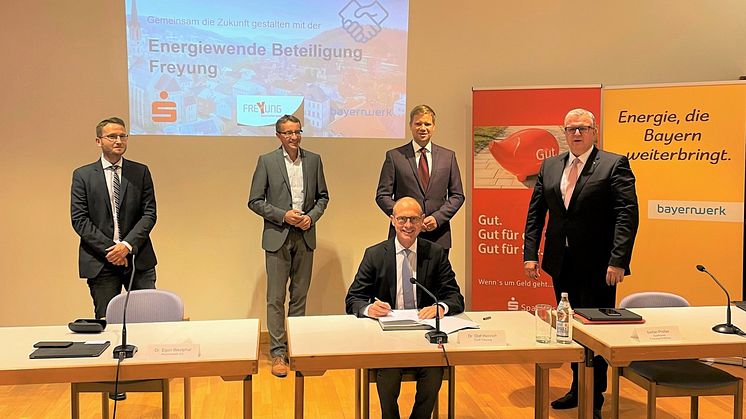 Bayernwerk-Chef Dr. Egon Leo Westphal bei der Unterzeichnung der Kooperationsvereinbarung (vorne) mit Sparkassenvorstand Stefan Proßer, Bürgermeister Dr. Olaf Heinrich, Thomas Oppelt (Bayernwerk) und Michael Pradl (Geschäftsleiter Stadt Freyung), (Reihe hinten von rechts nach links).