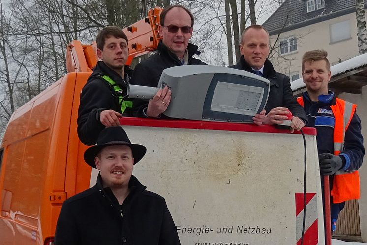 Steinbach am Wald ist die erste Gemeinde im Landkreis Kronach, die bei der Straßenbeleuchtung vollständig auf moderne und sparsame LED-Anlagen setzt. Kurz vor dem Abschluss der Umrüstung hat sich Erster Bürgermeister Thomas Löffler (2.v.r.) zusammen mit Edgar Müller (3.v.l.), Dominic Tschampel (l., beide Bayernwerk Netz) und Marco Fischer (2.v.l) und Tobias Schmidt (r., beide FEG) vor Ort ein Bild vom Erfolg der Maßnahme gemacht.