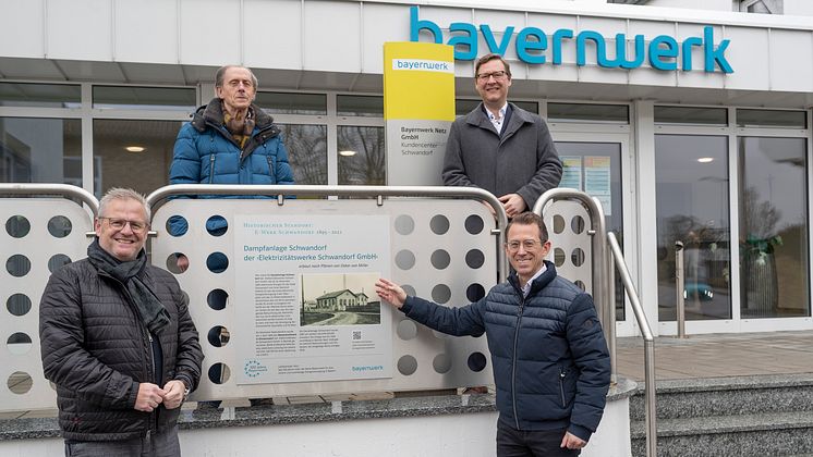 Am Donnerstag (16. Dezember) ist am Schwandorfer Kundencenter der Bayernwerk Netz GmbH im offiziellen Rahmen die bedeutende Rolle der Kreisstadt Schwandorf in der Geschichte der Energieversorgung in der Oberpfalz, gewürdigt worden. Dr. André Zorger, Leiter des Kommunalmanagements Ostbayern der Bayernwerk Netz GmbH (rechts), überreichte eine von insgesamt drei Erinnerungstafeln an Schwandorfs Oberbürgermeister Andreas Feller (links). Mit dabei Heimathistoriker Georg Wickles (oben links) und Bayernwerk-Kommunalbetreuer Wolfgang Dumm (oben rechts).