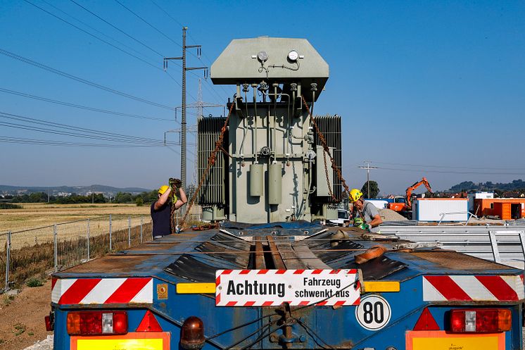 Südwestlich von Unterhaid im Landkreis Bamberg baut das Bayernwerk ein neues Umspannwerk. Mit dem rund 40 Tonnen schweren Netztransformator wurde das Herzstück der neuen Anlage geliefert .