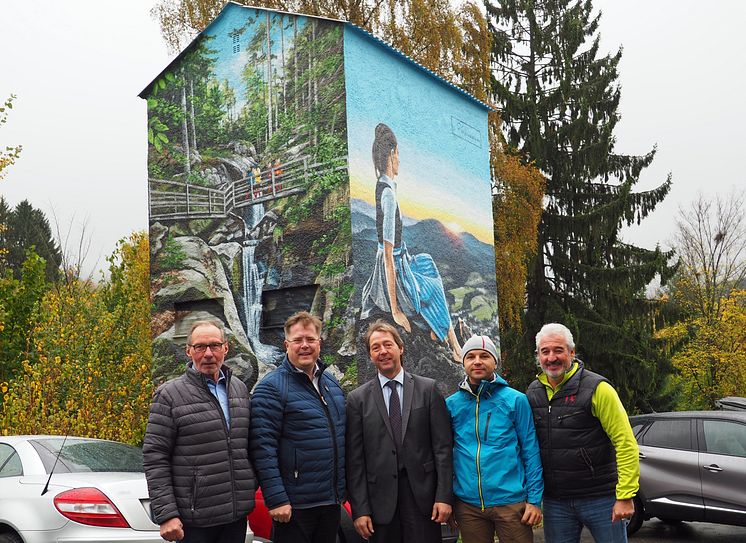 Auf vier Seiten zeigt das neu gestaltete Stromhäuschen Freizeitmotive in der beliebten Region aus vier Jahreszeiten. Bayernwerk-Kommunalbetreuer Johann Seebauer (Mitte) hat das Kunstwerk zusammen mit den Bürgermeistern Joachim Haller und Hans Sturm, Fotograf Marco Felgenhauer und Tourismus-Chef Bernhard Mosandl (v.l.) am 23. Oktober präsentiert.