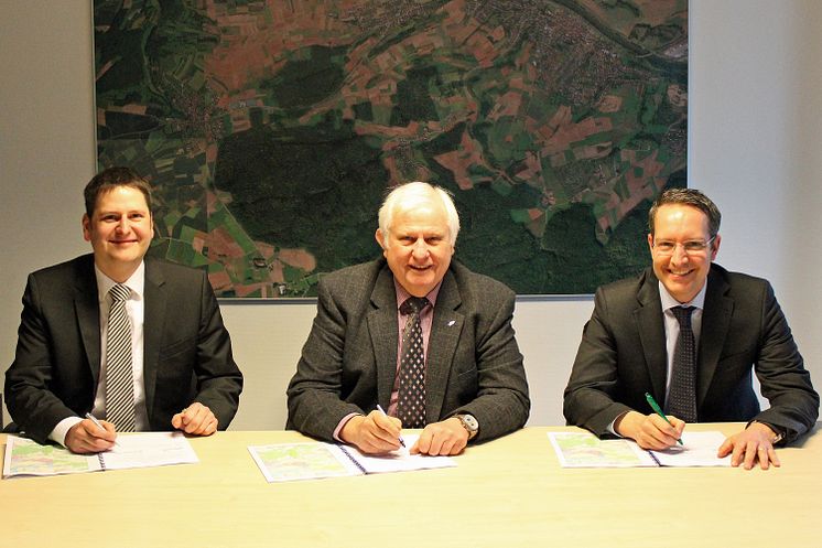 v.l.n.r. bei der Vertragsunterzeichnung: Kommunalbetreuer Christian Ziegler, 1. Bürgermeister Johann Pfister und Ingo Schroers, Leiter Kommunen und Kooperationen Bayernwerk Netz GmbH.