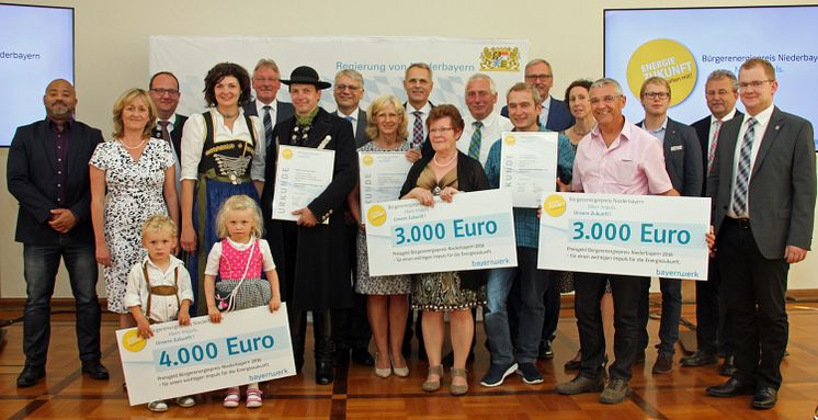 Das Bayernwerk hat zum vierten Mal den mit Unterstützung der Regierung von Niederbayern ins Leben gerufenen Bürgerenergiepreis vergeben. Die Sieger kommen aus Drachselsried (Lk Regen), Geiselhöring (Lk Straubing-Bogen) und Riedenburg (Lk Kelheim). Regierungsvizepräsident Dr. Helmut Graf (hinten, 4. v.l.) und Christoph Henzel (hinten, 5. v.l.), Leiter Kommunalmanagement Bayernwerk, gratulierten.