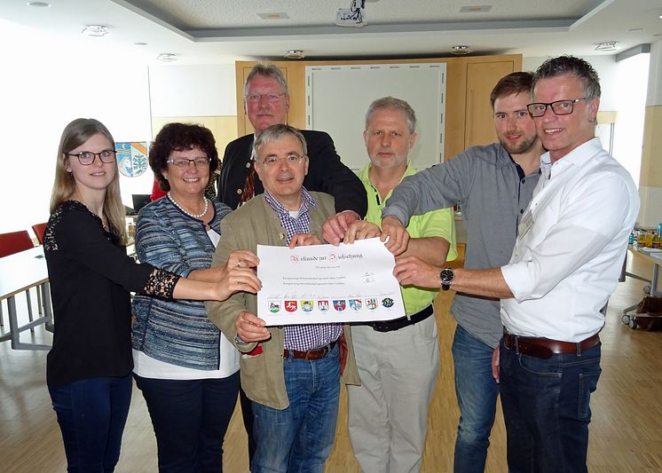 Insgesamt acht Kommunen arbeiten im Energieeffizienznetzwerk Ostbayern zusammen, um Einsparpotenziale in der täglichen Praxis zu finden und zu heben. Als gemeinsames Ziel haben Vertreter aus Nabburg, Osterhofen, Winzer, Pocking, Langquaid, Auerbach und Hirschau (v.l.) beim Treffen in Pocking am 12. April vereinbart, dass bis 2020 eine Einsparung von je sechs Prozent beim Wärme- und Stromverbrauch erreicht werden soll.