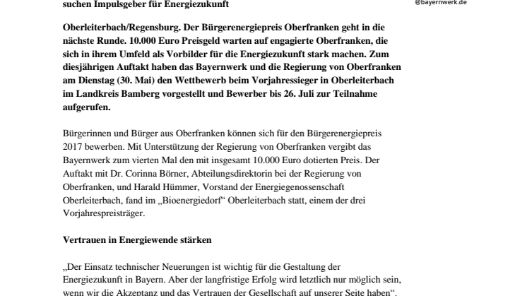 Bürgerinnen und Bürger aus Oberfranken können sich für den Bürgerenergiepreis 2017 bewerben. Mit Unterstützung der Regierung von Oberfranken vergibt das Bayernwerk zum vierten Mal den mit insgesamt 10.000 Euro dotierten Preis. Der Auftakt mit Dr. Corinna Boerner, Abteilungsdirektorin bei der Regierung von Oberfranken, und Harald Hümmer, Vorstand der Energiegenossenschaft Oberleiterbach, fand im „Bioenergiedorf“ Oberleiterbach statt, einem der drei Vorjahrespreisträger.
