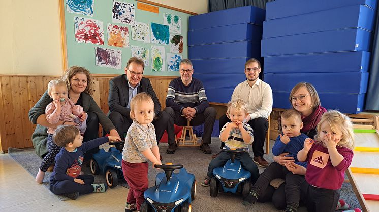 Zum Jahresanfang hatte das Bayernwerk im "kommunal.info"-Magazin Leserinnen und Leser zur Teilnahme an einem Gewinnspiel aufgerufen. Insgesamt 54 Bobby-Cars wurden dabei an verschiedene Träger verlost. Zu den glücklichen Gewinnern zählt auch Oberlangenstadt im Markt Küps (Landkreis Kronach). Bayernwerk-Kommunalbetreuer Marcel Boiger übergab in dieser Woche drei der navy-blauen Flitzer mit Bürgermeister Bernd Rebhan an Petra Sterzer, die Leiterin des Kindergartens. Die abgasfreien und ergonomisch geformten Spielzeugautos werden künftig ein sicheres Gefährt für die noch führerscheinlosen Nachwuchsfahrer sein.