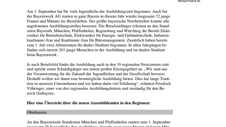Am 1. September hat für viele Jugendliche die Ausbildungszeit begonnen. Auch bei der Bayernwerk AG starten in ganz Bayern in diesem Jahr wieder insgesamt 72 junge Frauen und Männer ins Berufsleben. Der größte bayerische Netzbetreiber konnte alle angebotenen Ausbildungsstellen besetzen. Die Berufsanfänger erlernen an den Standorten Bayreuth, München, Pfaffenhofen, Regensburg und Würzburg die Berufe Elektroniker für Betriebstechnik, Elektroniker für Energie- und Gebäudetechnik, Industriekaufmann/-frau und Kaufmann/-frau für Büromanagement. Zusätzlich haben bereits zum 1. Juli zwei Abiturienten ihr duales Studium begonnen. In allen Jahrgängen befinden sich zurzeit 261 junge Menschen in der Ausbildung und im dualen Studium beim Bayernwerk.
