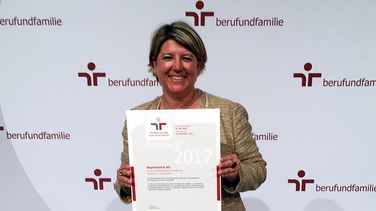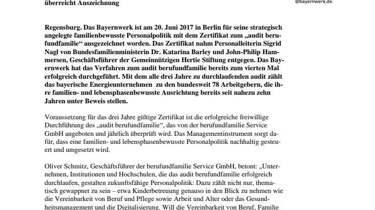 Regensburg. Das Bayernwerk ist am 20. Juni 2017 in Berlin für seine strategisch angelegte familienbewusste Personalpolitik mit dem Zertifikat zum „audit berufundfamilie“ ausgezeichnet worden. Das Zertifikat nahm Personalleiterin Sigrid Nagl von Bundesfamilienministerin Dr. Katarina Barley und John-Philip Hammersen, Geschäftsführer der Gemeinnützigen Hertie Stiftung entgegen. Das Bayernwerk hat das Verfahren zum audit berufundfamilie bereits zum vierten Mal erfolgreich durchgeführt. Mit dem alle drei Jahre zu durchlaufenden audit zählt das bayerische Energieunternehmenzu den bundesweit 78 Arbeitgebern, die ihrefamilien- und lebensphasenbewusste Ausrichtung bereits seit nahezu zehn Jahren unter Beweis stellen.