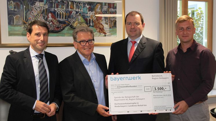 Hautnah erlebten die Einsatzkräfte des Bayernwerks die verheerenden Auswirkungen des Hochwassers für die betroffenen Menschen im Landkreis Rottal-Inn. In einer eigenen Spendenaktion hat die Belegschaft des Energieunternehmens in Niederbayern und der Oberpfalz Geld für die Hochwasseropfer gesammelt. Bayernwerk-Betriebsratsvorsitzender Albert Zettl und Personalvorstand Andreas Ladda übergaben die Spende in Höhe von 3.500 Euro an Landrat Michael Fahmüller.