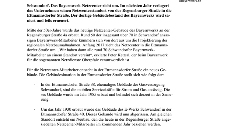 Mitte der 50er-Jahre wurde das heutige Netzcenter-Gebäude des Bayernwerks an der Regensburger Straße 4a erbaut. Rund 50 der insgesamt über 70 in Schwandorf ansässigen Bayernwerk-Mitarbeiter kümmern sich von dort aus um die Projektierung der regionalen Netzbaumaßnahmen. Anfang 2017 zieht das Netzcenter in die Ettmannsdorfer Straße um. „Wir haben dann alle rund 70 Schwandorfer Bayernwerk-Mitarbeiter an einem Standort vereint“, erklärte Peter Ketterl, der beim Bayernwerk für die sogenannten Netzdienste Oberpfalz verantwortlich ist.