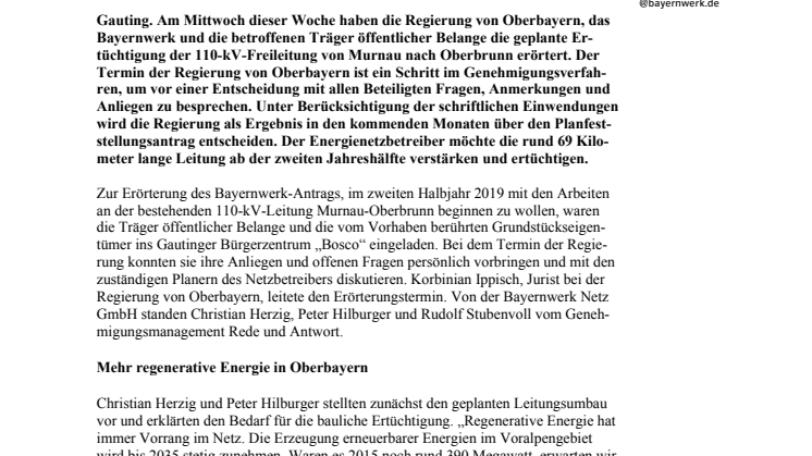 Zur Erörterung des Bayernwerk-Antrags, im zweiten Halbjahr 2019 mit den Arbeiten an der bestehenden 110-kV-Leitung Murnau-Oberbrunn beginnen zu wollen, waren die Träger öffentlicher Belange und die vom Vorhaben berührten Grundstückseigentümer ins Gautinger Bürgerzentrum „Bosco“ eingeladen. Bei dem Termin der Regierung konnten sie ihre Anliegen und offenen Fragen persönlich vorbringen und mit den zuständigen Planern des Netzbetreibers diskutieren. Korbinian Ippisch, Jurist bei der Regierung von Oberbayern, leitete den Erörterungstermin. Von der Bayernwerk Netz GmbH standen Christian Herzig, Peter Hilburger und Rudolf Stubenvoll vom Genehmigungsmanagement Rede und Antwort.