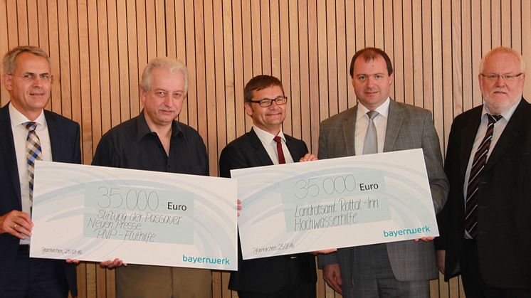 Im Rahmen eines Termins mit Landrat Michael Fahmüller übergab das Bayernwerk eine Spende für die Opfer der Hochwasserkatastrophe im Landkreis Rottal-Inn. In Summe spendet das Energieunternehmen 70.000 Euro. Zudem verzichtet das Unternehmen auf Kostenerstattungen für Reparaturen an kommunalen Energieanlagen und für die Freistellung von Mitarbeitern für den Einsatz bei Feuerwehren oder Technischem Hilfswerk.