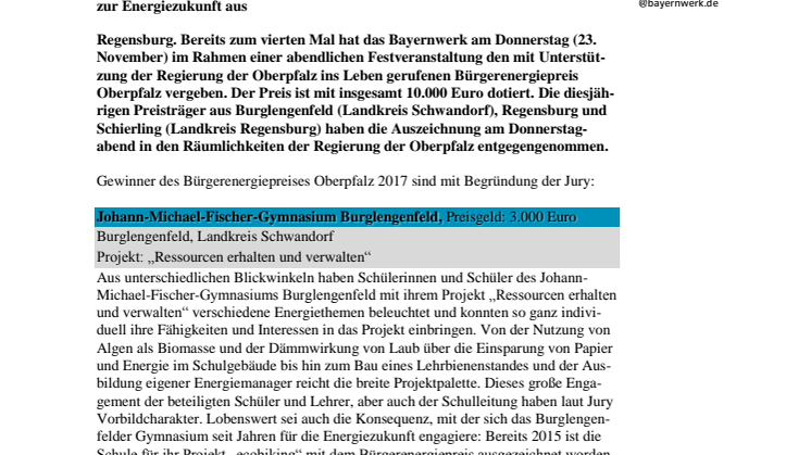 Alle Preisträger des Bürgerenergiepreises Oberpfalz 2017 werden unter www.bayernwerk.de/buergerenergiepreis mit kurzen Videos vorgestellt. Der Bürgerenergiepreis Oberpfalz wird auch im kommenden Jahr fortgesetzt.
