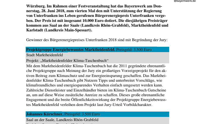 Würzburg. Im Rahmen einer Festveranstaltung hat das Bayernwerk am Donnerstag, 28. Juni 2018, zum vierten Mal den mit Unterstützung der Regierung von Unterfranken ins Leben gerufenen Bürgerenergiepreis Unterfranken vergeben. Der Preis ist mit insgesamt 10.000 Euro dotiert. Die diesjährigen Preisträger kommen aus Saal an der Saale (Landkreis Rhön-Grabfeld), Marktheidenfeld und Karlstadt (Landkreis Main-Spessart).