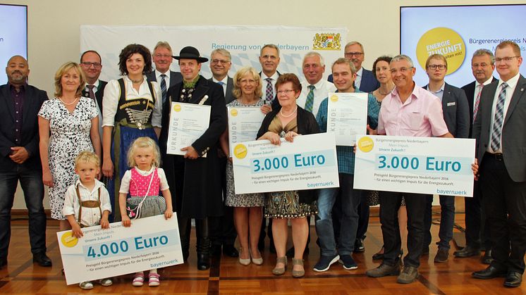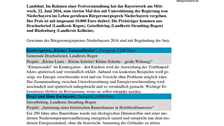Landshut. Das Bayernwerk hat am Mittwoch, 22. Juni 2016, zum vierten Mal den mit Unterstützung der Regierung von Niederbayern ins Leben gerufenen Bürgerenergiepreis Niederbayern vergeben. Der Preis ist mit insgesamt 10.000 Euro dotiert. Die Preisträger kommen aus Drachselsried (Landkreis Regen), Geiselhöring (Landkreis Straubing-Bogen) und Riedenburg (Landkreis Kelheim).