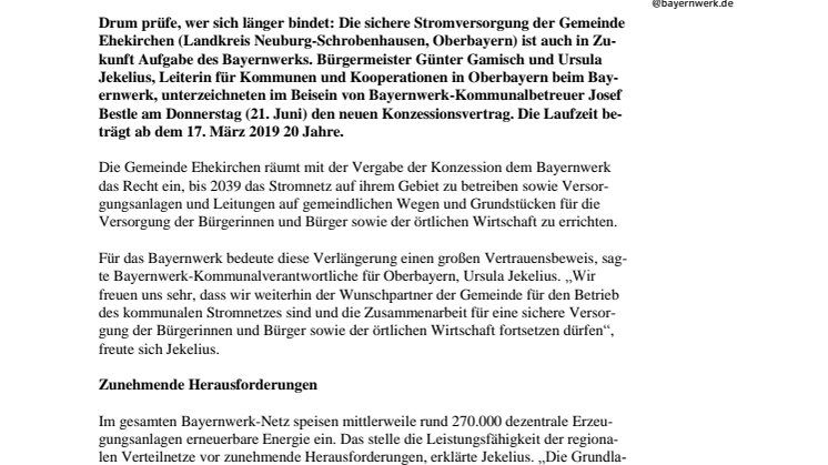 Drum prüfe, wer sich länger bindet: Die sichere Stromversorgung der Gemeinde Ehekirchen (Landkreis Neuburg-Schrobenhausen, Oberbayern) ist auch in Zukunft Aufgabe des Bayernwerks. Bürgermeister Günter Gamisch und Ursula Jekelius, Leiterin für Kommunen und Kooperationen in Oberbayern beim Bayernwerk, unterzeichneten im Beisein von Bayernwerk-Kommunalbetreuer Josef Bestle am Donnerstag (21. Juni) den neuen Konzessionsvertrag. Die Laufzeit beträgt ab dem 17. März 2019 20 Jahre.