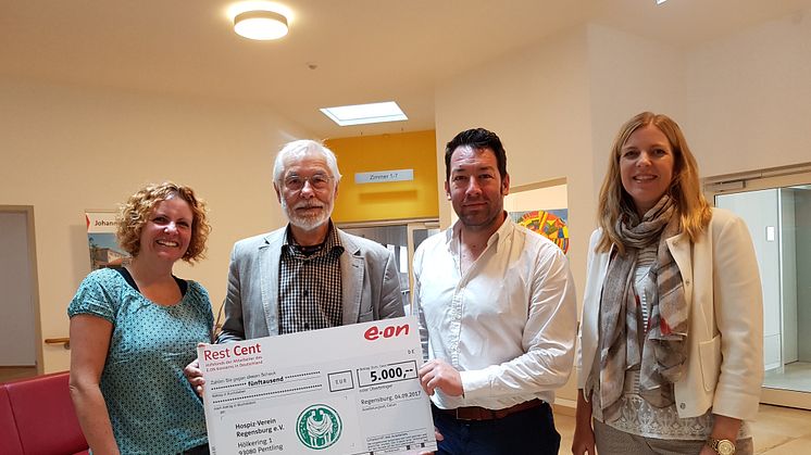 Unterstützt wird die Hospizarbeit in Regensburg nun auch durch die Mitarbeiterinnen und Mitarbeiter des E.ON-Konzerns. Seit vielen Jahren verzichtet ein Großteil der Kolleginnen und Kollegen in Deutschland am Monatsende auf die Auszahlung von Netto-Cent-Beträgen – freiwillig und für einen guten Zweck. Diese Beträge fließen in den sogenannten Hilfsfonds „RestCent“. Die dabei auflaufende Summe wird durch den E.ON-Konzern verdoppelt und wohltätigen Zwecken zugeführt.