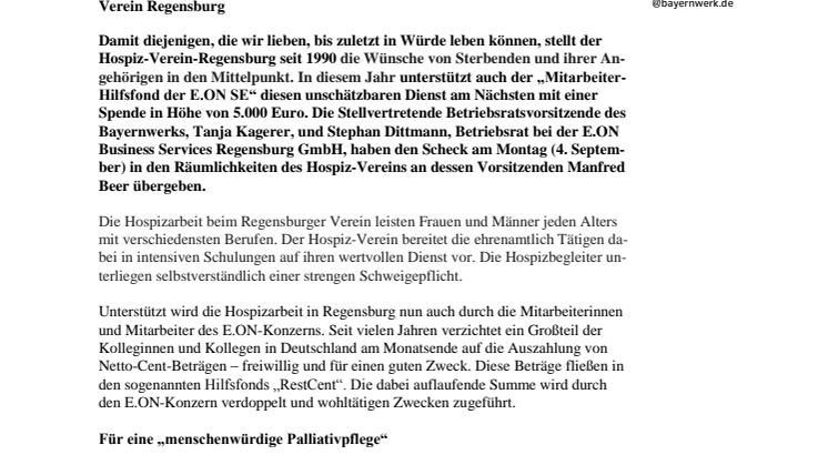 Hilfsfonds der E.ON-Mitarbeiterinnen und -Mitarbeiter unterstützt Hospiz-Verein Regensburg