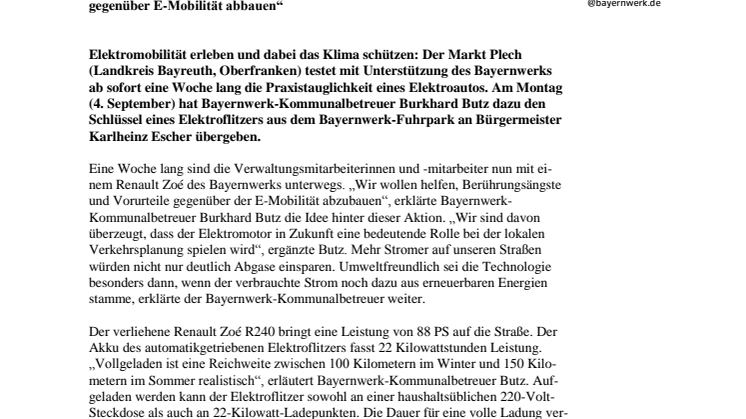 Markt Plech testet Stromer des Bayernwerks – Netzbetreiber will „Vorurteile gegenüber E-Mobilität abbauen“