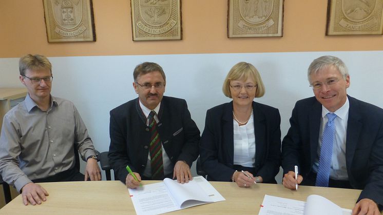 Bei einem gemeinsamen Termin im Rathaus unterzeichneten der Erste Bürgermeister Michael Hausperger und Ursula Jekelius, beim Bayernwerk für Kommunen und Kooperationen in Oberbayern verantwortlich, den neuen Konzessionsvertrag. Mit vor Ort waren Armin Irlbeck, Kommunalbetreuer des Netzbetreibers, und der Geschäftsleiter der Verwaltungsgemeinschaft, Georg Obermaier,