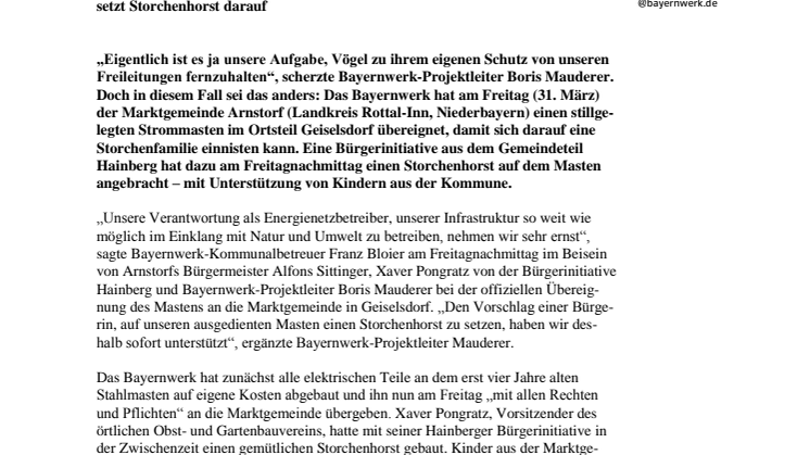 „Unsere Verantwortung als Energienetzbetreiber, unserer Infrastruktur so weit wie möglich im Einklang mit Natur und Umwelt zu betreiben, nehmen wir sehr ernst“, sagte Bayernwerk-Kommunalbetreuer Franz Bloier am Freitagnachmittag im Beisein von Arnstorfs Bürgermeister Alfons Sittinger, Xaver Pongratz von der Bürgerinitiative Hainberg und Bayernwerk-Projektleiter Boris Mauderer bei der offiziellen Übereignung des Mastens an die Marktgemeinde in Geiselsdorf. „Den Vorschlag einer Bürgerin, auf unseren ausgedienten Masten einen Storchenhorst zu setzen, haben wir deshalb sofort unterstützt“, ergänzte Bayernwerk-Projektleiter Mauderer.