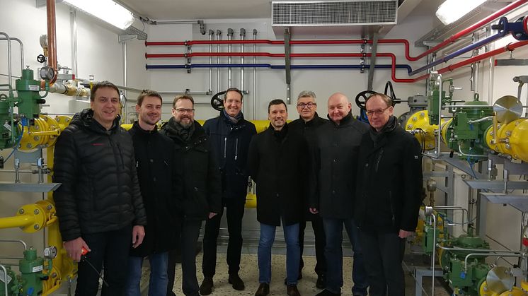 Zur offiziellen Inbetriebnahme am Donnerstag (12. Dezember) fanden sich der Tettauer Bürgermeister Peter Ebertsch, Michael Wagner, Technischer Leiter Glas-Produktion Deutschland, und Thomas Schmidt, Leiter Energy Economics, beide HEINZ-GLAS und seitens des Bayernwerks Ingo Schroers, Geschäftsbereichsleiter Kommunen, Konrad Walter, Bereichsleiter Netzdienste Oberfranken, Kommunalbetreuer Edgar Müller, sowie die für die Ausführung der Arbeiten verantwortlichen Markus Seidel, Leiter Netzbau Naila, und Ulrich Wicklein, Leiter Gasservice Oberfranken, am Werksgelände von HEINZ-GLAS ein.