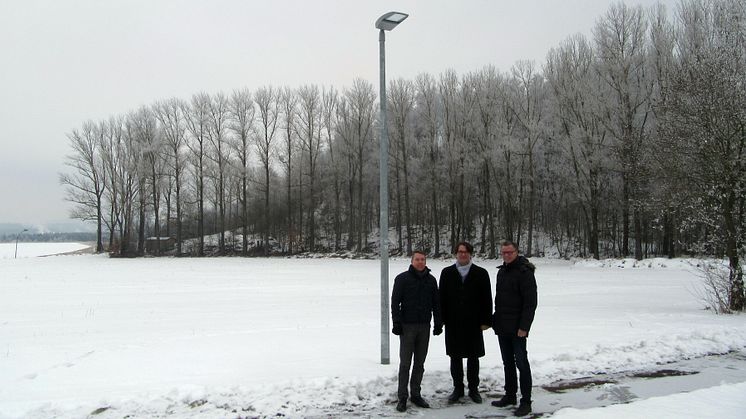 Bürgermeister Hermann Falk, Johann König und Markus Windisch, Kommunalbetreuer beim Bayernwerk, stellten am Dienstag, den 24. Januar, das Projekt vor Ort vor. Es ist das erste dieser Art in der Oberpfalz. „Wir haben im Auftrag der Stadt insgesamt 14 moderne LED-Straßenlaternen entlang des Radwegs installiert. Das Besondere an den Brennstellen ist, dass sie mit Bewegungsmeldern und Steuerungsmodulen ausgestattet sind, die sich programmieren lassen“, erläuterte Johann König. Für den Betrieb seien die Brennstellen nun so eingestellt, dass sie im Normalzustand mit 30 Prozent der Leistung leuchten. Nähern sich Radfahrer oder gegebenenfalls auch Fußgänger, werde die Leistung automatisch auf 100 Prozent gesetzt.