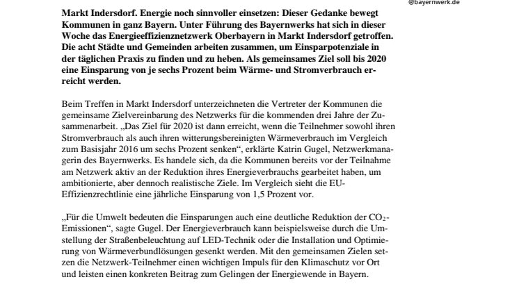 „Für die Umwelt bedeuten die Einsparungen auch eine deutliche Reduktion der CO2-Emissionen“, sagte Gugel. Der Energieverbrauch kann beispielsweise durch die Umstellung der Straßenbeleuchtung auf LED-Technik oder die Installation und Optimierung von Wärmeverbundlösungen gesenkt werden. Mit den gemeinsamen Zielen setzen die Netzwerk-Teilnehmer einen wichtigen Impuls für den Klimaschutz vor Ort und leisten einen konkreten Beitrag zum Gelingen der Energiewende in Bayern.