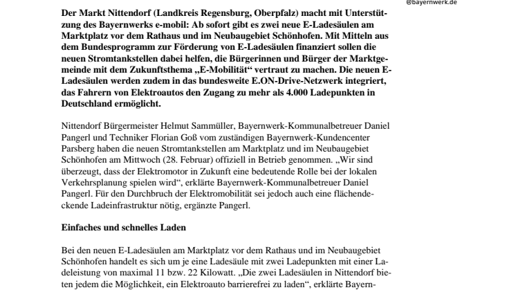 Der Markt Nittendorf (Landkreis Regensburg, Oberpfalz) macht mit Unterstützung des Bayernwerks e-mobil: Ab sofort gibt es zwei neue E-Ladesäulen am Marktplatz vor dem Rathaus und im Neubaugebiet Schönhofen. Mit Mitteln aus dem Bundesprogramm zur Förderung von E-Ladesäulen finanziert sollen die neuen Stromtankstellen dabei helfen, die Bürgerinnen und Bürger der Marktgemeinde mit dem Zukunftsthema „E-Mobilität“ vertraut zu machen. Die neuen E-Ladesäulen werden zudem in das bundesweite E.ON-Drive-Netzwerk integriert, das Fahrern von Elektroautos den Zugang zu mehr als 4.000 Ladepunkten in Deutschland ermöglicht.