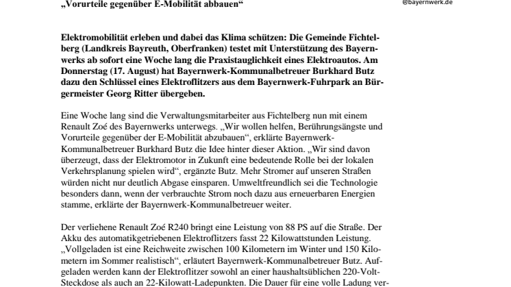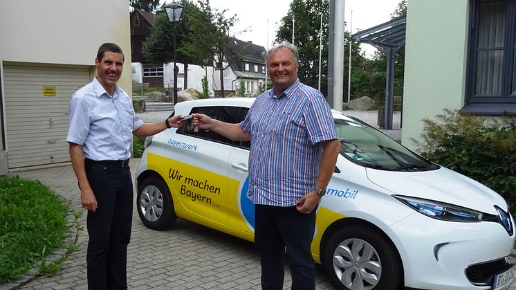 Elektromobilität erleben und dabei das Klima schützen: Die Gemeinde Fichtelberg (Landkreis Bayreuth, Oberfranken) testet mit Unterstützung des Bayernwerks ab sofort eine Woche lang die Praxistauglichkeit eines Elektroautos. Am Donnerstag (17. August) hat Bayernwerk-Kommunalbetreuer Burkhard Butz dazu den Schlüssel eines Elektroflitzers aus dem Bayernwerk-Fuhrpark an Bürgermeister Georg Ritter übergeben.