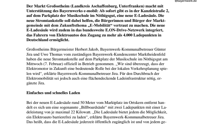 Der Markt Großostheim (Landkreis Aschaffenburg, Unterfranken) macht mit Unterstützung des Bayernwerks e-mobil: Ab sofort gibt es in der Kanzleistraße 2, auf dem Parkplatz der Musikschule im Nöthigsgut, eine neue E-Ladesäule. Die neue Stromtankstelle soll dabei helfen, die Bürgerinnen und Bürger der Marktgemeinde mit dem Zukunftsthema „E-Mobilität“ vertraut zu machen. Die neue E-Ladesäule wird zudem in das bundesweite E.ON-Drive-Netzwerk integriert, das Fahrern von Elektroautos den Zugang zu mehr als 4.000 Ladepunkten in Deutschland ermöglicht.
