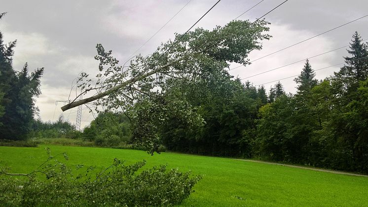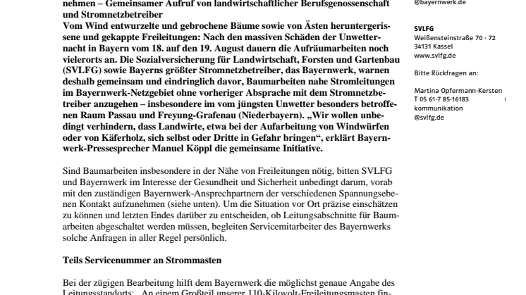 Vom Wind entwurzelte und gebrochene Bäume sowie von Ästen heruntergerissene und gekappte Freileitungen: Nach den massiven Schäden der Unwetternacht in Bayern vom 18. auf den 19. August dauern die Aufräumarbeiten noch vielerorts an. Die Sozialversicherung für Landwirtschaft, Forsten und Gartenbau (SVLFG) sowie Bayerns größter Stromnetzbetreiber, das Bayernwerk, warnen deshalb gemeinsam und eindringlich davor, Baumarbeiten nahe Stromleitungen im Bayernwerk-Netzgebiet ohne vorheriger Absprache mit dem Stromnetzbetreiber anzugehen – insbesondere im vom jüngsten Unwetter besonders betroffenen Raum Passau und Freyung-Grafenau (Niederbayern). „Wir wollen unbedingt verhindern, dass Landwirte, etwa bei der Aufarbeitung von Windwürfen oder von Käferholz, sich selbst oder Dritte in Gefahr bringen“, erklärt Bayernwerk-Pressesprecher Manuel Köppl die gemeinsame Initiative.