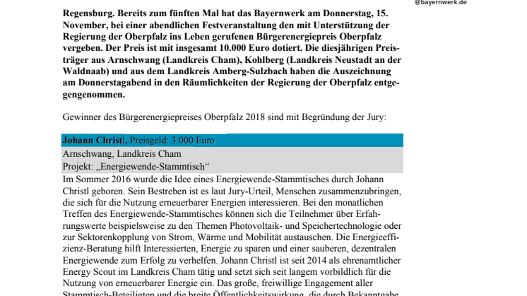 Der Bürgerenergiepreis Oberpfalz wird im kommenden Jahr fortgesetzt. Bewerbungen können ab sofort wieder beim Bayernwerk eingereicht werden. Mehr Infos unter www.bayernwerk.de/buergerenergiepreis