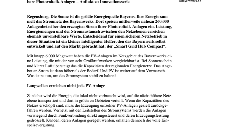 Regensburg. Die Sonne ist die größte Energiequelle Bayerns. Ihre Energie sammelt das Stromnetz des Bayernwerks. Dort speisen mittlerweile nahezu 260.000 Anlagenbetreiber den erzeugten Strom ihrer Photovoltaik-Anlagen ein. Leistung, Energiemengen und der Stromaustausch zwischen den Netzebenen erreichen ehemals unvorstellbare Werte. Entscheidend für einen sicheren Netzbetrieb in dieser Situation ist ein kleiner intelligenter Helfer, den das Bayernwerk selbst entwickelt und auf den Markt gebracht hat: der „Smart Grid Hub Compact“.