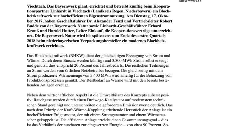 Viechtach. Das Bayernwerk plant, errichtet und betreibt künftig beim Kooperationspartner Linhardt in Viechtach (Landkreis Regen, Niederbayern) ein Blockheizkraftwerk zur hocheffizienten Eigenstromnutzung. Am Dienstag, 17. Oktober 2017, haben Geschäftsführer Dr. Alexander Fenzl und Vertriebsleiter Robert Budde von der Bayernwerk Natur sowie Linhardt-Geschäftsführer Erhard Krauß und Harald Hutter, Leiter Einkauf, die Kooperationsverträge unterzeichnet. Die Bayernwerk Natur wird bis spätestens zum Ende des ersten Quartals 2018 beim niederbayerischen Verpackungshersteller ein modernes Blockheizkraftwerk errichten.