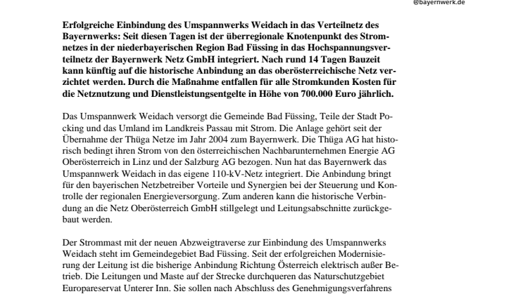 Erfolgreiche Einbindung des Umspannwerks Weidach in das Verteilnetz des Bayernwerks: Seit diesen Tagen ist der überregionale Knotenpunkt des Stromnetzes in der niederbayerischen Region Bad Füssing in das Hochspannungsverteilnetz der Bayernwerk Netz GmbH integriert. Nach rund 14 Tagen Bauzeit kann künftig auf die historische Anbindung an das oberösterreichische Netz verzichtet werden. Durch die Maßnahme entfallen für alle Stromkunden Kosten für die Netznutzung und Dienstleistungsentgelte in Höhe von 700.000 Euro jährlich.