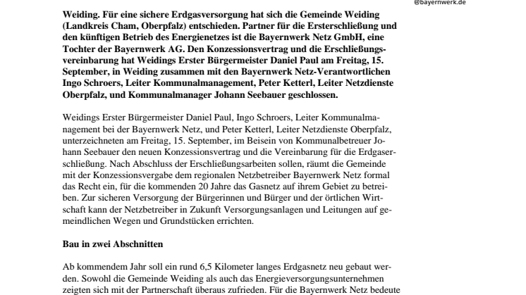 Weiding. Für eine sichere Erdgasversorgung hat sich die Gemeinde Weiding (Landkreis Cham, Oberpfalz) entschieden. Partner für die Ersterschließung und den künftigen Betrieb des Energienetzes ist die Bayernwerk Netz GmbH, eine Tochter der Bayernwerk AG. Den Konzessionsvertrag und die Erschließungsvereinbarung hat Weidings Erster Bürgermeister Daniel Paul am Freitag, 15. September, in Weiding zusammen mit den Bayernwerk Netz-Verantwortlichen Ingo Schroers, Leiter Kommunalmanagement, Peter Ketterl, Leiter Netzdienste Oberpfalz, und Kommunalmanager Johann Seebauer geschlossen.