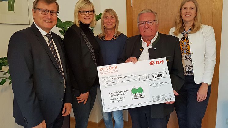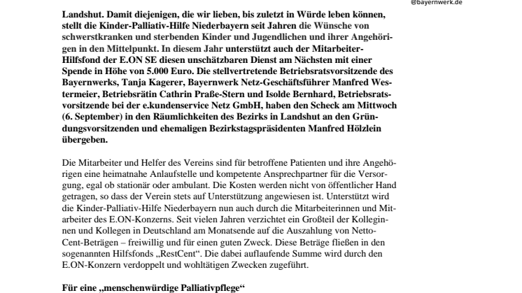 Die Mitarbeiter und Helfer des Vereins sind für betroffene Patienten und ihre Angehörigen eine heimatnahe Anlaufstelle und kompetente Ansprechpartner für die Versorgung, egal ob stationär oder ambulant. Die Kosten werden nicht von öffentlicher Hand getragen, so dass der Verein stets auf Unterstützung angewiesen ist.Unterstützt wird die Kinder-Palliativ-Hilfe Niederbayern nun auch durch die Mitarbeiterinnen und Mitarbeiter des E.ON-Konzerns. Seit vielen Jahren verzichtet ein Großteil der Kolleginnen und Kollegen in Deutschland am Monatsende auf die Auszahlung von Netto-Cent-Beträgen – freiwillig und für einen guten Zweck. Diese Beträge fließen in den sogenannten Hilfsfonds „RestCent“. Die dabei auflaufende Summe wird durch den E.ON-Konzern verdoppelt und wohltätigen Zwecken zugeführt.