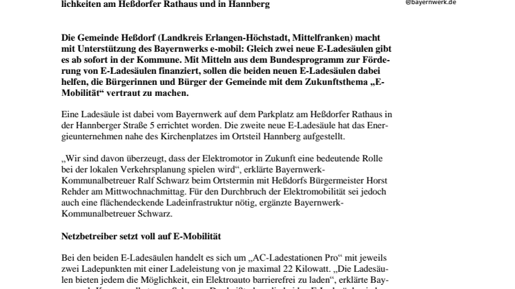 Eine Ladesäule ist dabei vom Bayernwerk auf dem Parkplatz am Heßdorfer Rathaus in der Hannberger Straße 5 errichtet worden. Die zweite neue E-Ladesäule hat das Energieunternehmen nahe des Kirchenplatzes im Ortsteil Hannberg aufgestellt.