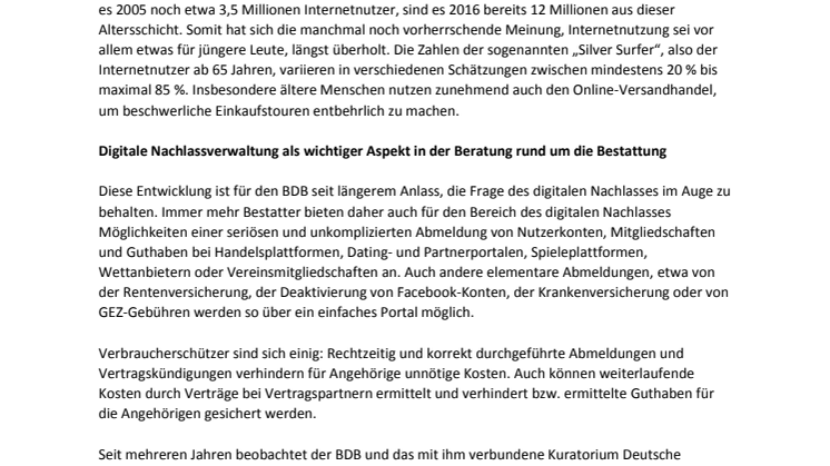 Diese Entwicklung ist für den BDB seit längerem Anlass, die Frage des digitalen Nachlasses im Auge zu behalten. Immer mehr Bestatter bieten daher auch für den Bereich des digitalen Nachlasses Möglichkeiten einer seriösen und unkomplizierten Abmeldung von Nutzerkonten, Mitgliedschaften und Guthaben bei Handelsplattformen, Dating- und Partnerportalen, Spieleplattformen, Wettanbietern oder Vereinsmitgliedschaften an. Auch andere elementare Abmeldungen, etwa von der Rentenversicherung, der Deaktivierung von Facebook-Konten, der Krankenversicherung oder von GEZ-Gebühren werden so über ein einfaches Portal möglich.