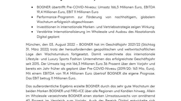 Munich, August 03, 2022 – Despite the challenging geopolitical and global economic situation BOGNER has continued its growth course in the financial year 2021/22 (reporting date March 31, 2022). The international lifestyle and luxury sports fashion company thereby recorded its most successful financial year since 2015. At 166.3 million euros, sales were 36 percent up on the previous year and already above pre-COVID levels a year earlier than planned (2019/20: €163 million). With an EBITDA of 19.4 million euros, BOGNER exceeded its own forecast. EBIT totaled 11 million euros.
