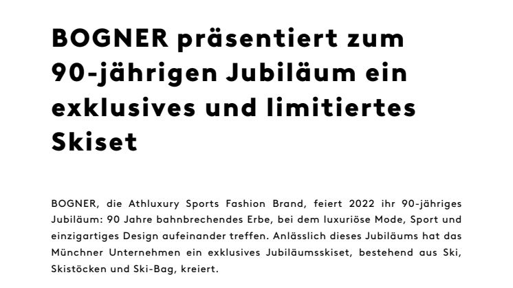 BOGNER, the Athluxury Sports Fashion Brand, celebrates its 90thanniversary in 2022: 90 years of pioneering heritage combining luxury fashion, sports and unique design. To mark this anniversary, the Munich-based company has created an exclusive anniversary ski set consisting of skis, ski poles and a ski bag.