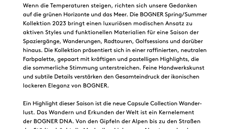 As temperatures rise, thoughts turn towards green horizons and the seaside. The BOGNER Spring Summer 2023 collection brings a luxury fashion approach to active styles and functional materials for a season of leisurely strolls, hiking, biking, golfing and beyond. The collection is presented in a sophisticated neutral palette paired with both bold and pastel highlights to affirm the summery mood. Fine craftsmanship and subtle details enhance the overall feeling of the iconic BOGNER loose elegance.