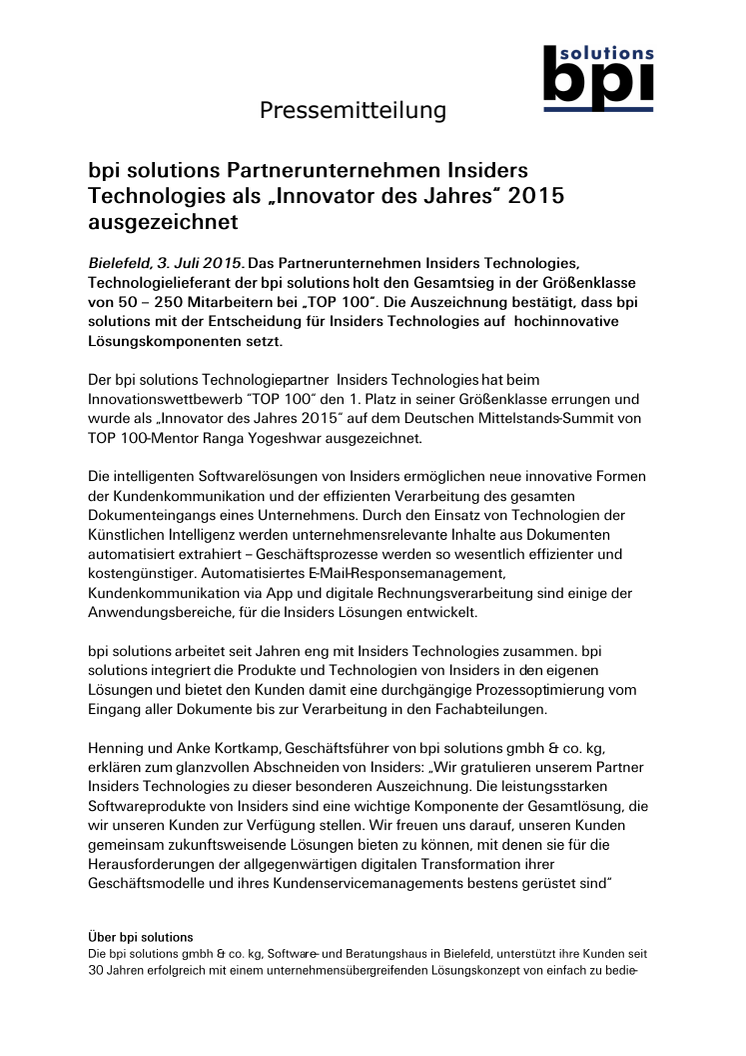 Das Partnerunternehmen Insiders Technologies, Technologielieferant der bpi solutions holt den Gesamtsieg in der Größenklasse von 50 – 250 Mitarbeitern bei „TOP 100“. Die Auszeichnung bestätigt, dass bpi solutions mit der Entscheidung für Insiders Technologies auf hochinnovative Lösungskomponenten setzt.