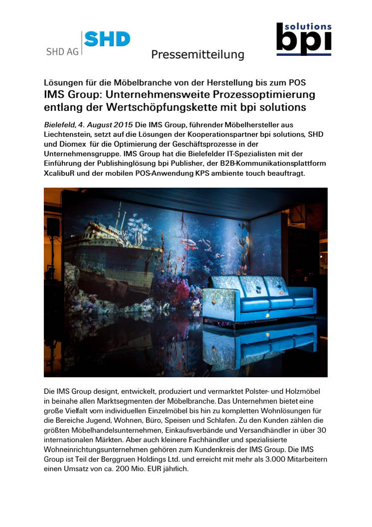Die IMS Group, Möbelhersteller aus Liechtenstein, setzt auf die Lösungen der Kooperationspartner bpi solutions, SHD und Diomex für die Optimierung der Geschäftsprozesse in der Unternehmensgruppe. IMS Group hat die Bielefelder IT-Spezialisten mit der Einführung der Publishinglösung bpi Publisher, der B2B-Kommunikationsplattform XcalibuR und der mobilen POS-Anwendung KPS ambiente touch beauftragt.