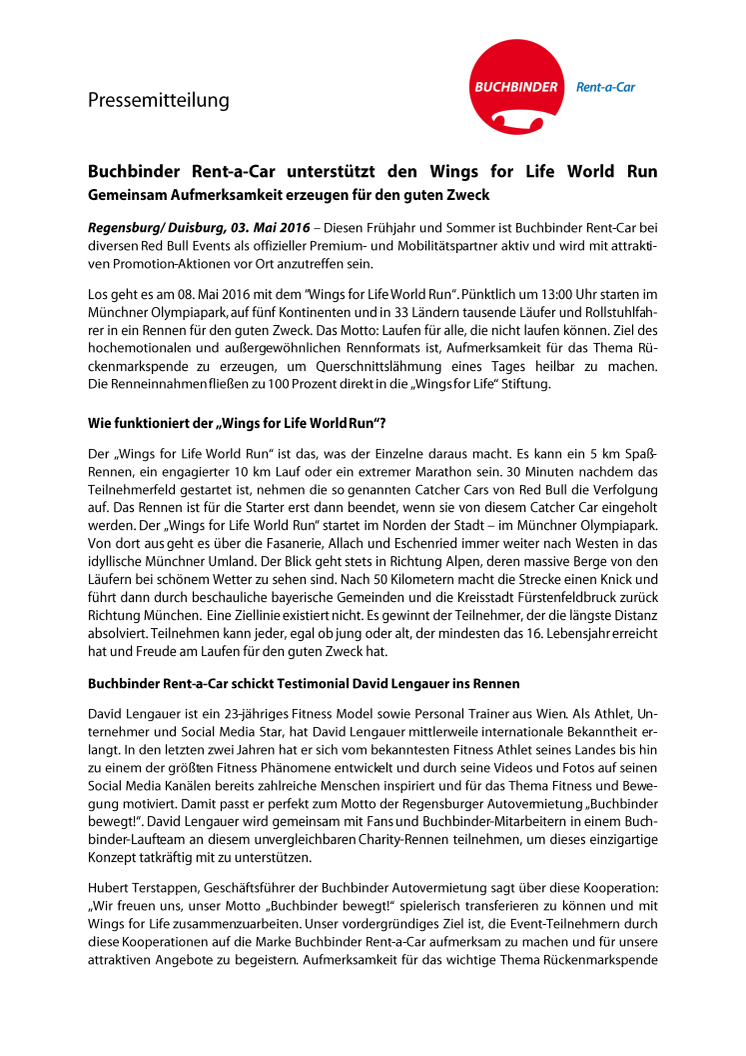 Buchbinder Rent-a-Car unterstützt den Wings for Life World Run
