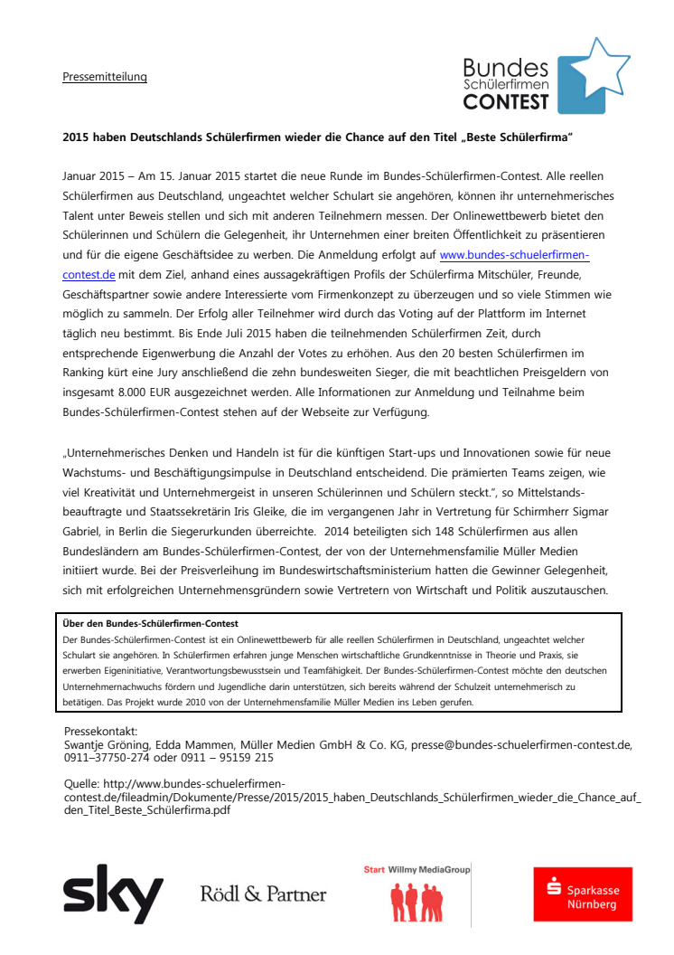 Januar 2015 – Am 15. Januar 2015 startet die neue Runde im Bundes-Schülerfirmen-Contest. Alle reellen Schülerfirmen aus Deutschland, ungeachtet welcher Schulart sie angehören, können ihr unternehmerisches Talent unter Beweis stellen und sich mit anderen Teilnehmern messen.