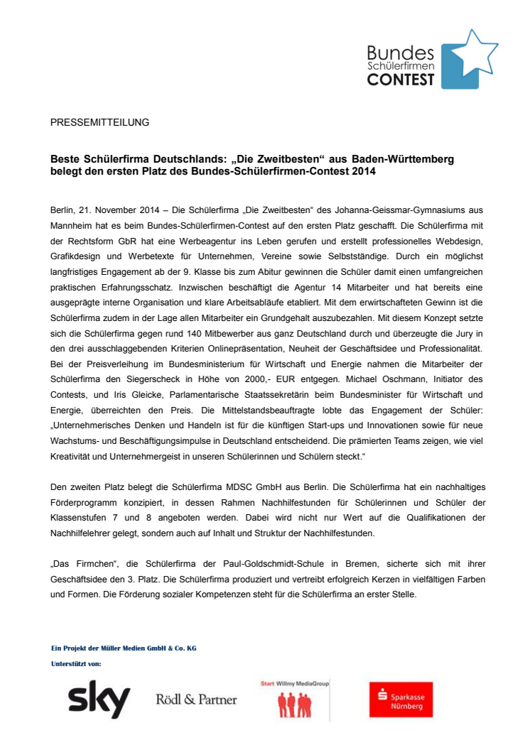 Berlin, 21. November 2014 – Die Schülerfirma „Die Zweitbesten“ des Johanna-Geissmar-Gymnasiums aus Mannheim hat es beim Bundes-Schülerfirmen-Contest auf den ersten Platz geschafft. Die Schülerfirma mit der Rechtsform GbR hat eine Werbeagentur ins Leben gerufen und erstellt professionelles Webdesign, Grafikdesign und Werbetexte für Unternehmen, Vereine sowie Selbstständige.