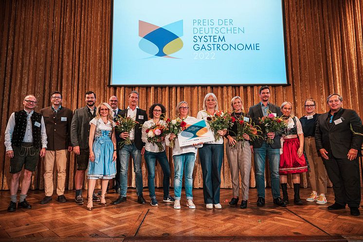 Preisträger des Preises der Deutschen Systemgastronomie 2022 mit BdS-Hauptgeschäftsführerin Andrea Belegante (4.v.rl.) und BdS-Vizepräsident Alexander van Bömmel (5.v.l.) sowie Jurymitgliedern